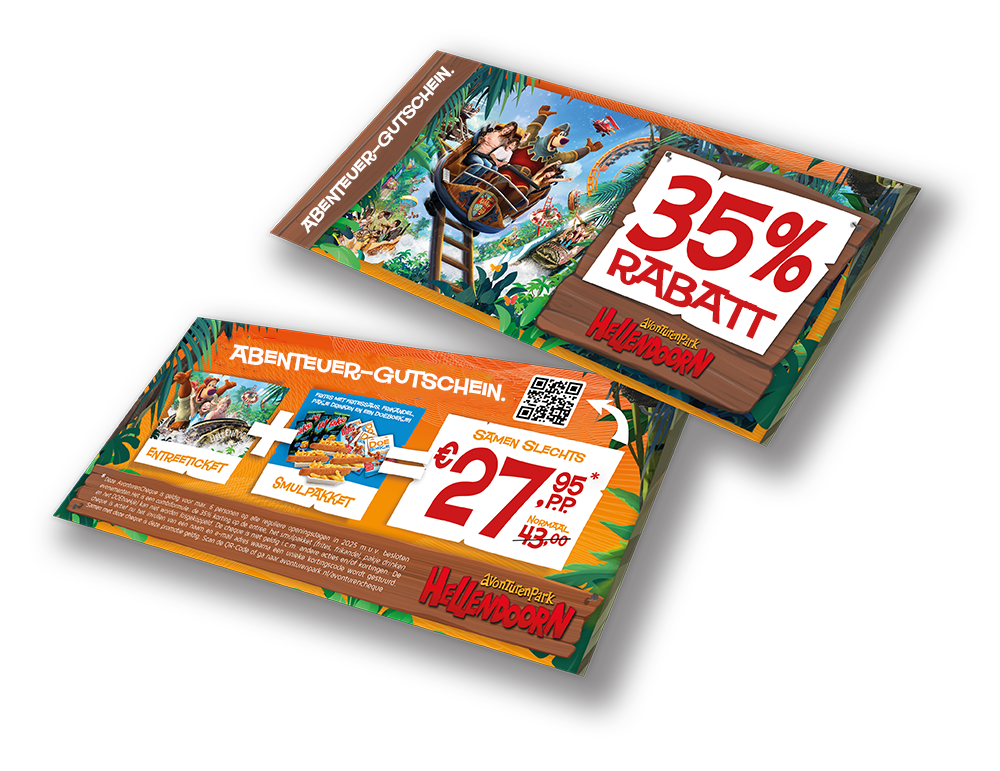 Lade deinen persönlichen Wertgutschein herunter und gib ihn an der Kasse des Abenteuerparks Hellendoorn ab. So erhältst du den günstigen Online-Preis direkt vor Ort – zahlbar in bar oder mit EC-Karte.