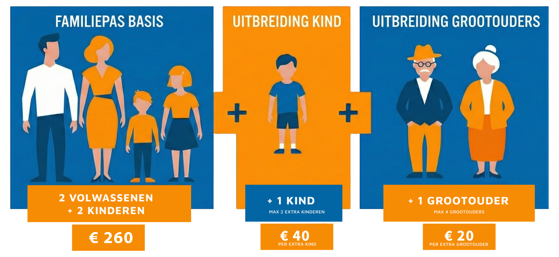 De Familiepas is geldig voor 2 volwassenen en 2 kinderen t/m 17 jaar. Aanschaffen van het basisabonnement kan uitsluitend online.
