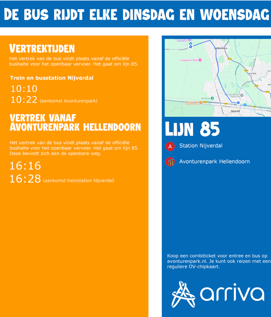 Deze zomer reis je extra makkelijk naar Avonturenpark Hellendoorn! Vanuit diverse vakantieparken in de omgeving én vanaf de treinstations in Ommen en Nijverdal rijdt er een speciale busverbinding rechtstreeks naar het park. Ideaal voor een zorgeloze dag vol avontuur!