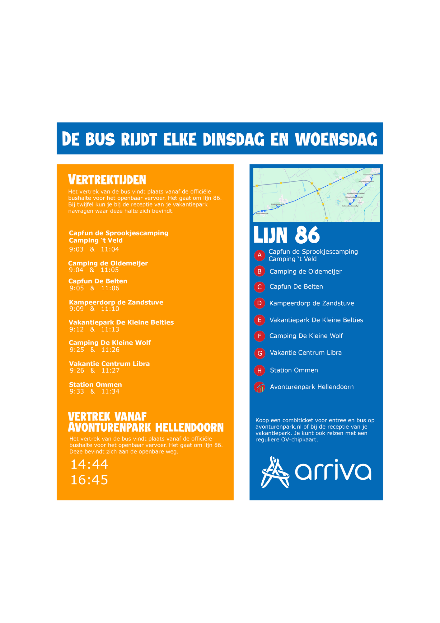 Deze busslijn van Arriva rijdt in deze zomervakantie in de periode van dinsdag 29 juli t/m woensdag 20 augustus, op dinsdag en woensdag
